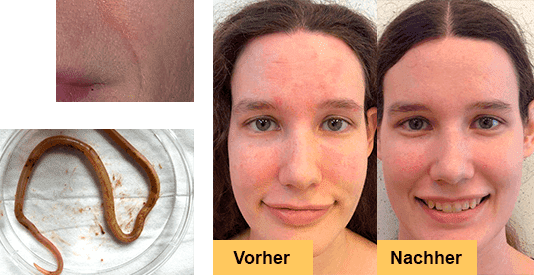 Viele Jahre lang litt ich an Dermatitis und Allergien, kein Mittel half mir. Ich konnte nicht einmal im Sommer offene Kleidung tragen, weil alle Schultern und Arme mit Allergien bedeckt waren. Ein Bekannter riet Parazax und sagte, dass mein Problem durch Parasiten verursacht werden könnte. Nach ein paar Einnahmen von Parazax kam ein Haufen von Parasiten aus mir heraus. Ich bin schockiert! Aber die Hauptsache ist, dass die Haut jetzt in perfekt Zustand ist.